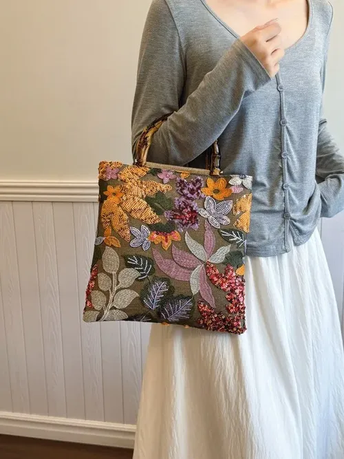 New Bamboo Handle Tote Bag - Stylish Large-Capacity Retro Women's Handbag with Colorful Sequins & Heavy Embroidery | Trendy Evening Bag (Orange, Flower Pattern Random Cut)389 sales